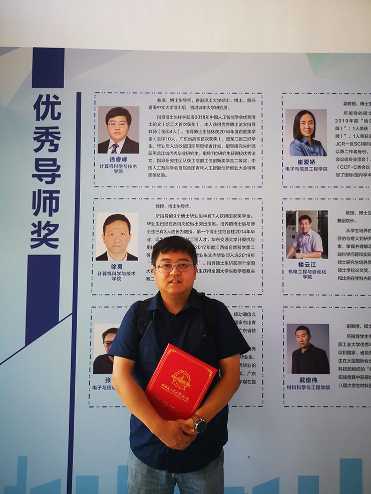 徐睿峰老师在2010年指导研究生以来,指导博士生桂林2018年获中国人工智能学会优秀博士论文,本人获得中国人工智能学会优秀博士论文指导教师。指导博士生桂林获2016年百度奖学金,黑龙江省三好学生,毕业后入选欧盟玛丽居里学者计划。指导研究生叶璐获黑龙江省优秀毕业研究生。先后指导七位研究生获得校优秀毕业论文。指导研究生团队获工信部工信创新奖学金二等奖,中国人工智能学会首届全国青年人工智能创新创业大会特等奖等奖励。